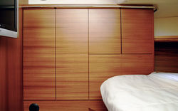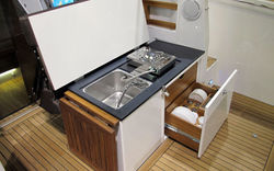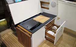 Det er et lite pentry under førerbenken, så båten inneholdr alt man trenger også til en weekend.